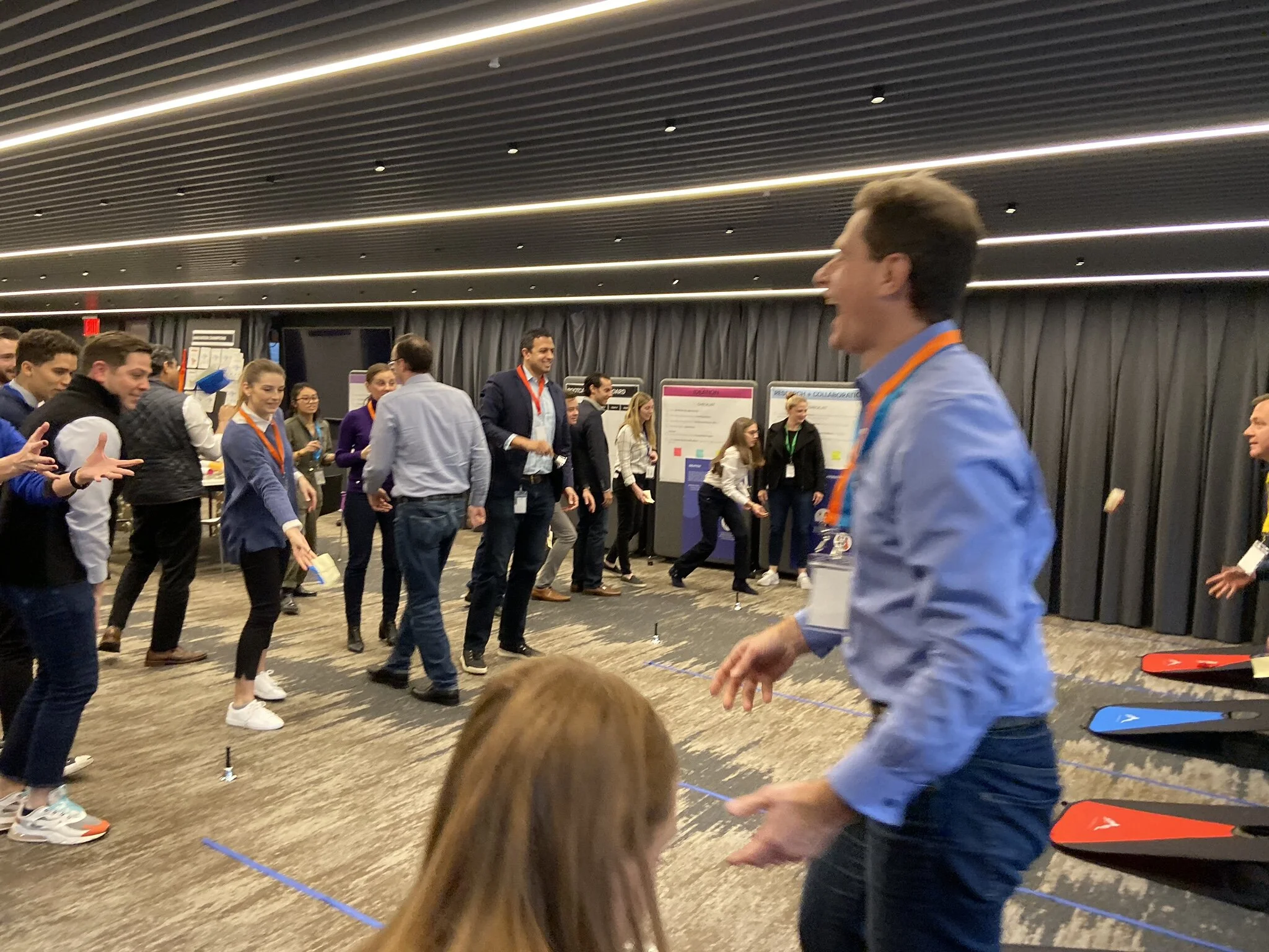 Participants had to find 3 insights/news from the company. Once the news was collected, they were written on post-its that were attached to a cornhole bean bag. Each team competed against each other to be the first team to make all 3 bean bags.
