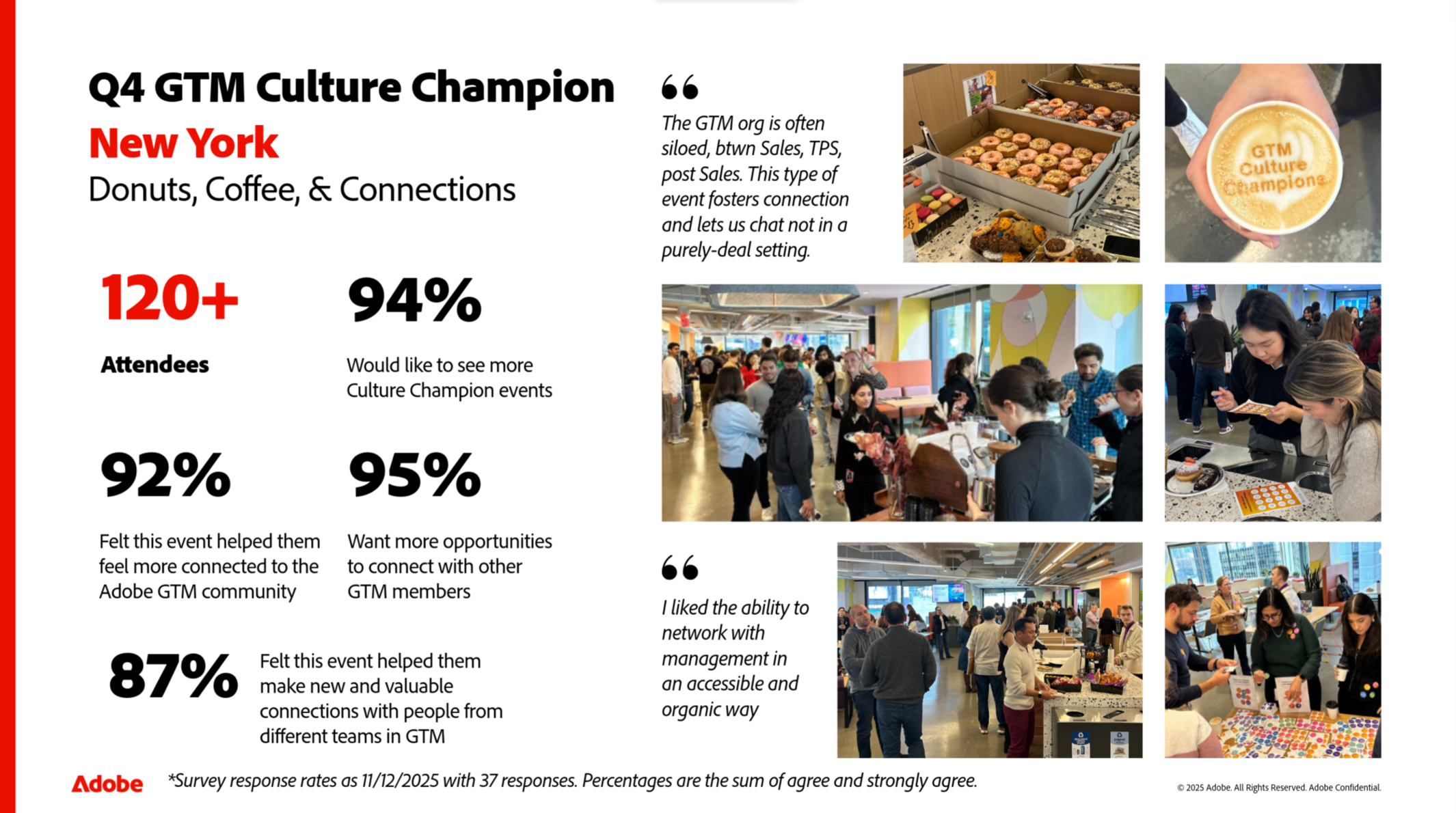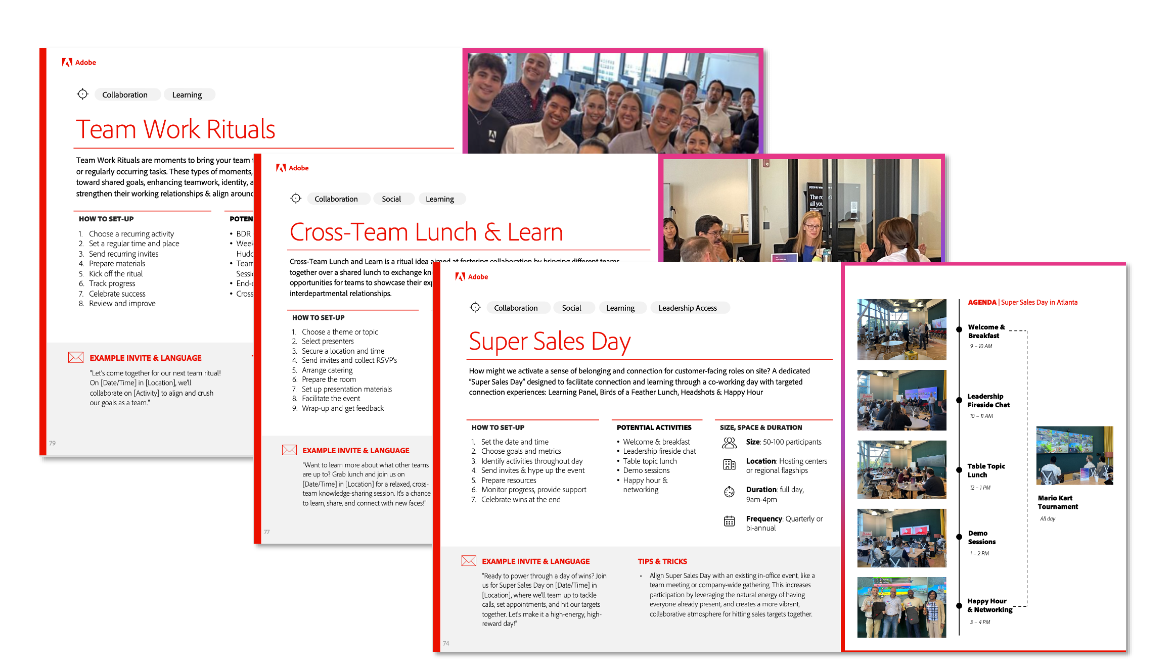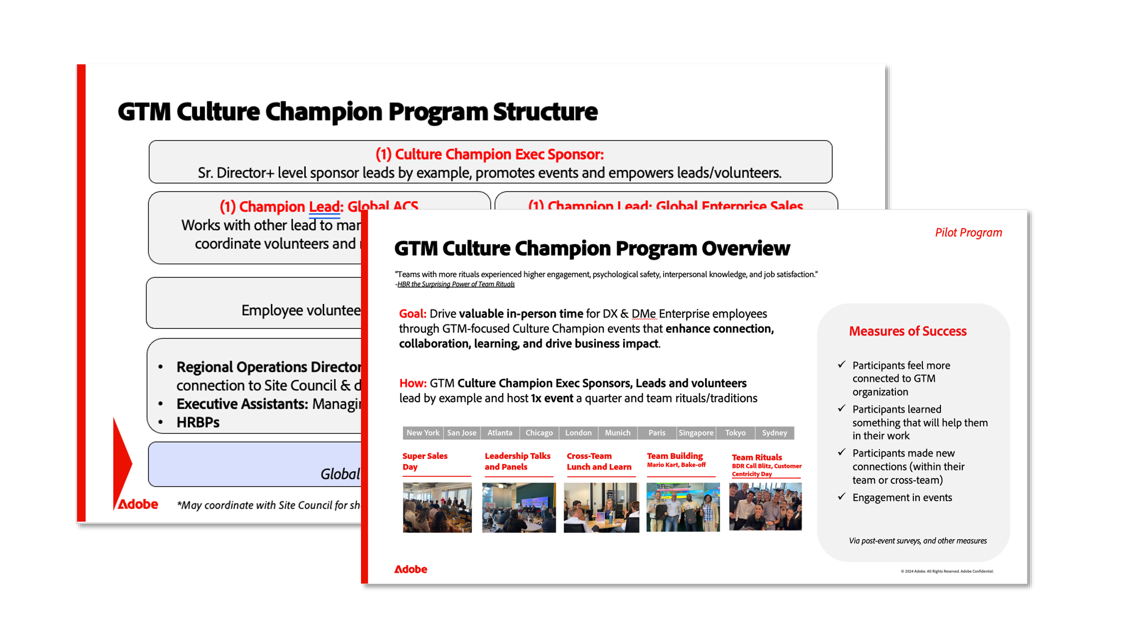 A global program designed to create meaningful in-person connection through locally driven experiences and team rituals for Adobe’s GTM organization, shifting from centralized events to a distributed model of experience design.
